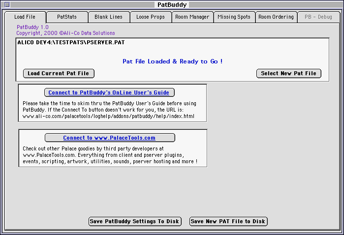 The "Load File" screen is used to select and load your pserver's *.pat file into PatBuddy's memory. The changes you make while using PatBuddy are effecting the copy of your *.pat file that PatBuddy has loaded into memory, not to the *.pat file that you selected for PatBuddy to load from your hard drive. By doing this, you can reverse your changes, make all types of different changes, and totally mess up without ever effecting the *.pat file on your hard drive. The other utilities in PatBuddy will be disabled until you load a *.pat file. When you have made all of the changes that you want, you then click the "Save New PAT FIle to Disk" button. That will bring up a "Save" window that will let you name your new *.pat file and save it to the location you choose. If you choose the same name and location of an existing file, PatBuddy will ask you if you wish to replace that file with the new *.pat file.